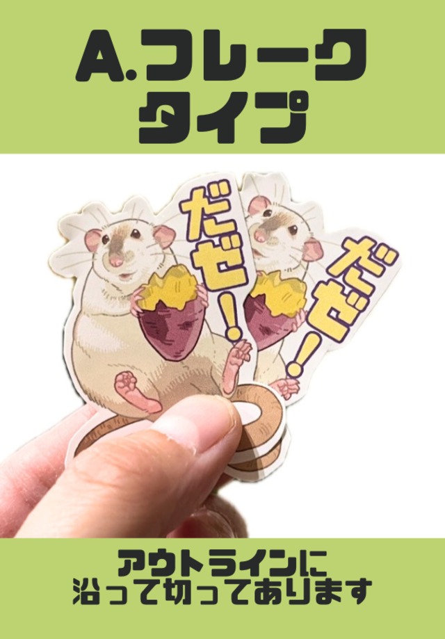 【大豆の「だゼ!」シール】 大豆の口癖(?) 「だゼ!」付きのセリフシール(1枚)です。 イラストデザインは、イラストレーターのyugaさんに作成していただきました。 大好きなお芋を持ってニコニコな大豆君が可愛いです(*´ω`*) (デザインはどちらも同じです) デザイン@yugaさん https://x.com/yuga_ ・再剥離シール ・サイズ:50×40mm タイプが2種類から選べます! A:フレークタイプ・・・デザインのアウトラインに合わせて切ってあります B:シートタイプ・・・四角いシールです