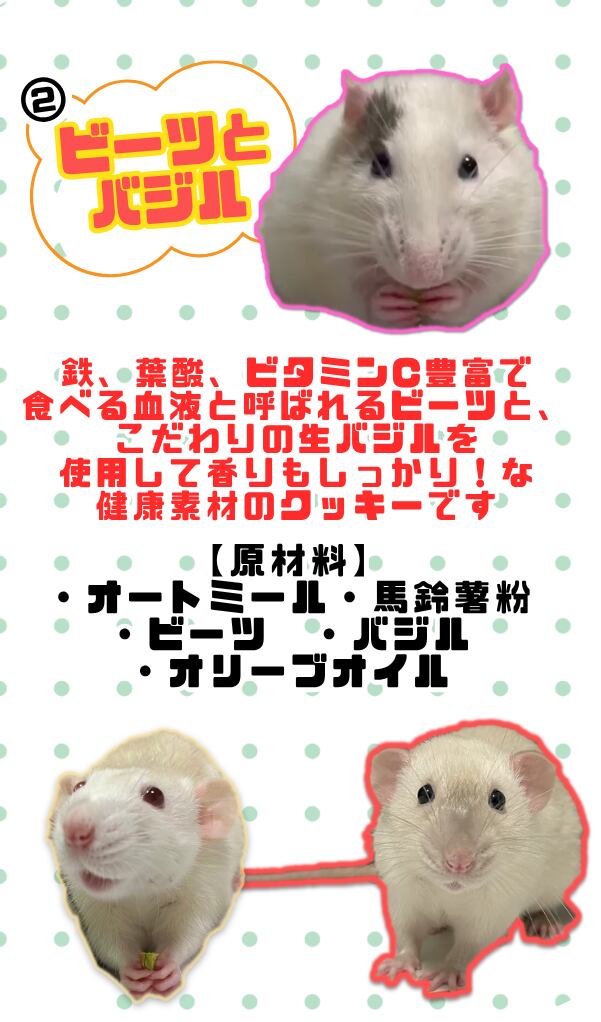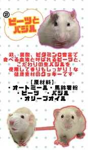 こだわりの生バジルを使用することで、香りもよくネズミちゃんの嗅覚もしっかり刺激しつつ美味しく食べられるおやつです。