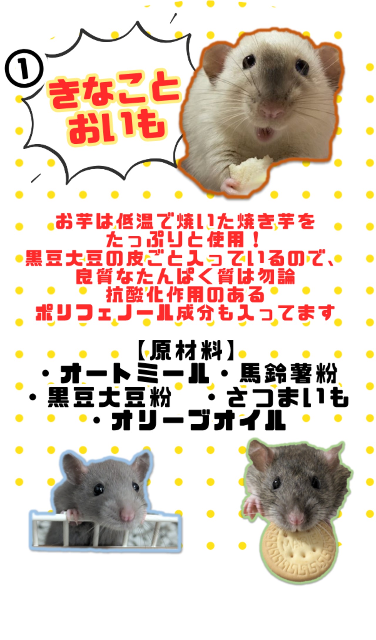▶原材料:さつまいも、オートミール、馬鈴薯粉、黒豆大豆粉、オリーブオイル